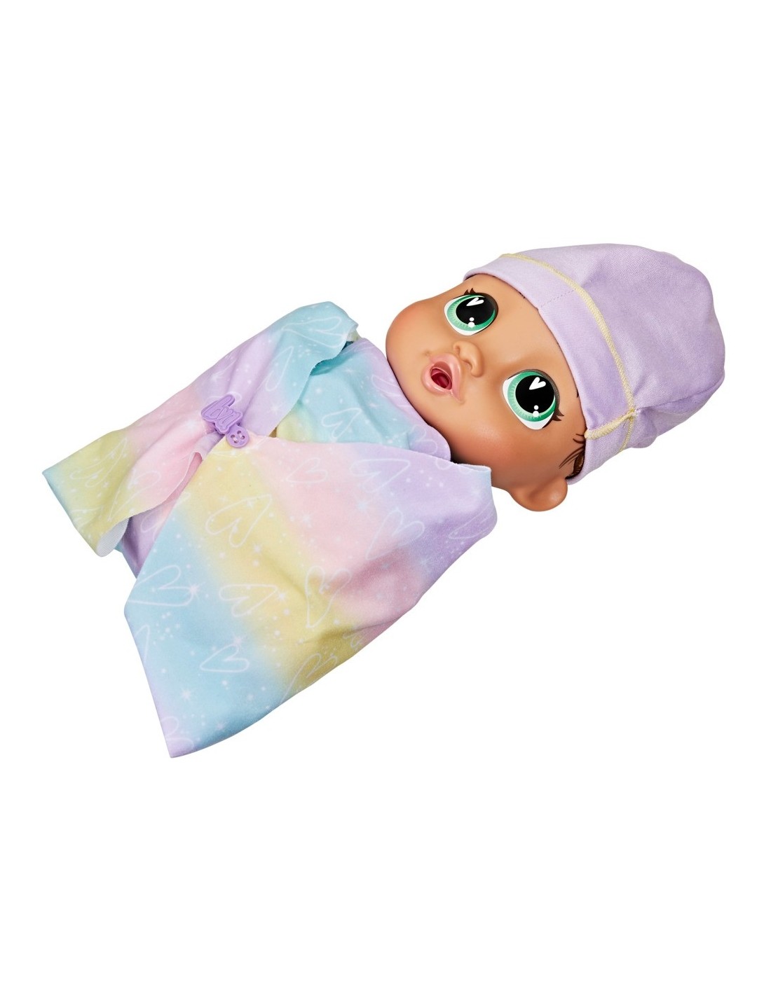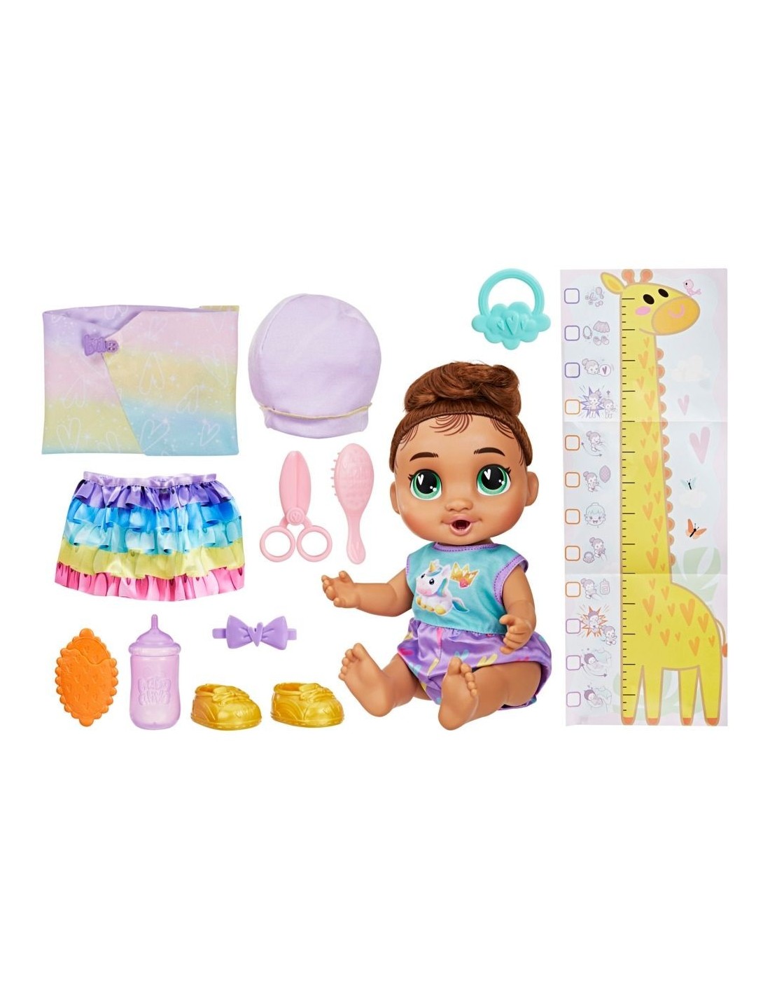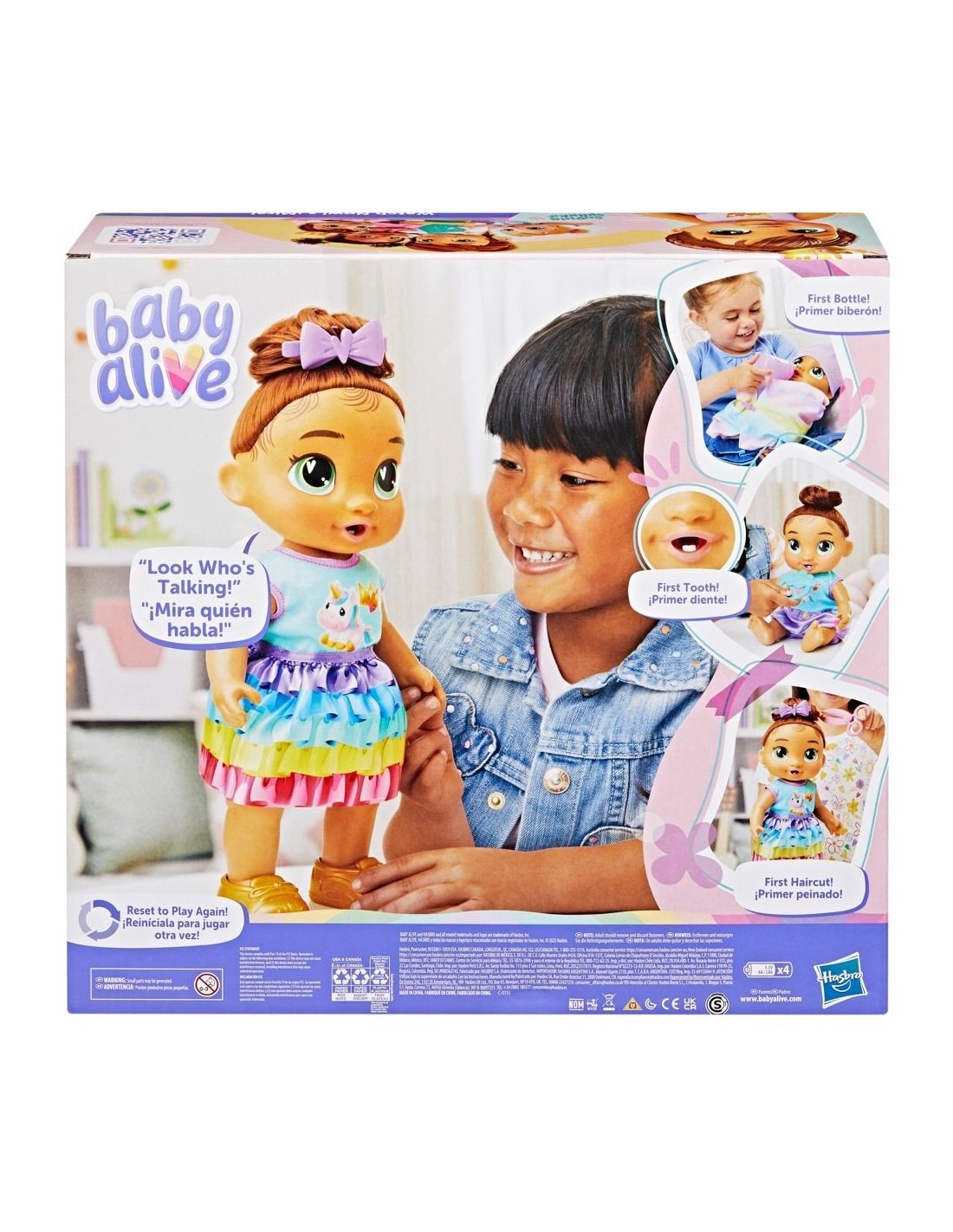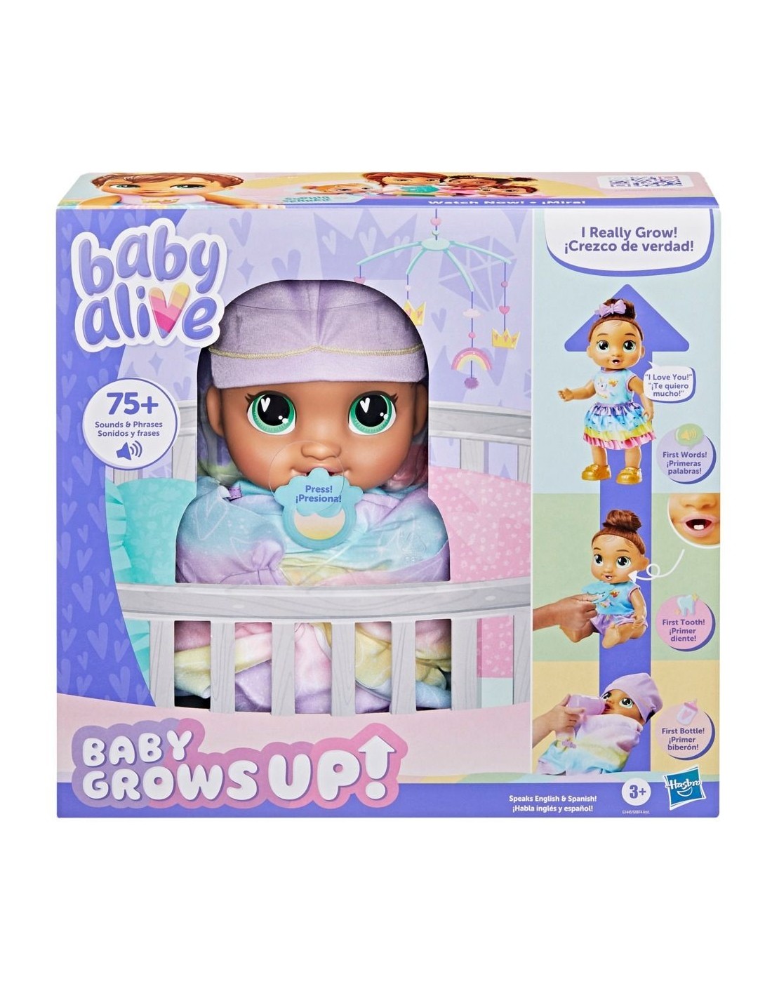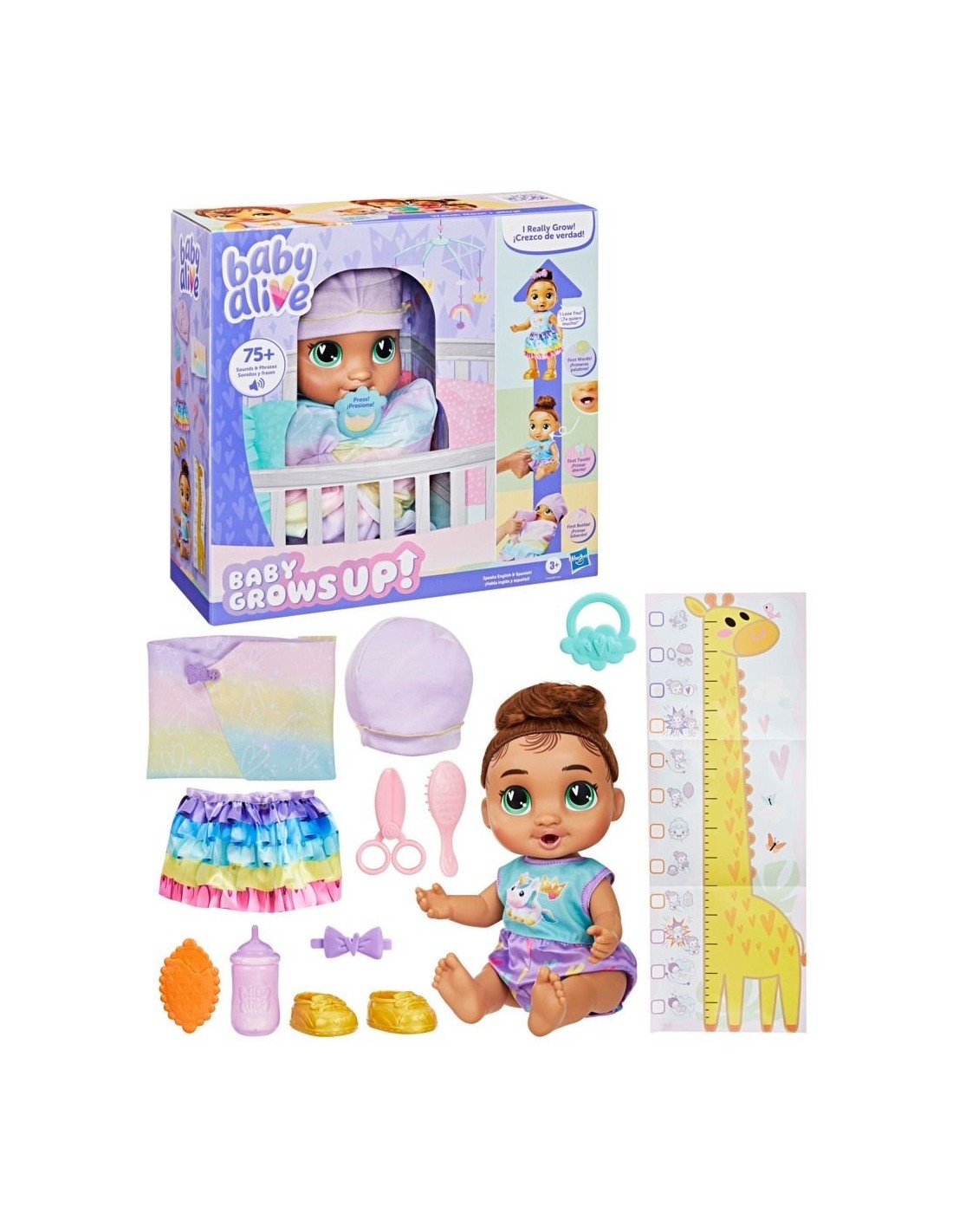 ¡Desbloquea momentos interactivos de las muñecas bebés con Baby Grows Up Sophia Sparkle! Esta muñeca Baby Alive empieza en la etapa de recién nacida, en la cual podrás mecerla y darle su primer biberón. ¡Al llegar a la etapa de bebé, dejará atrás su envoltura! ¡Dale el biberón y el chupete a la bebé para revelar su primer diente! Luego, dale su primer bocado de comida para ver cómo ""desaparece"" un trozo al presionar la comida de juguete contra su boca. Cuando oigas una campanada, es hora de ayudar a Sophia Sparkle a ponerse de pie y convertirse en niña pequeña. Usa los accesorios de la muñeca bebé para vestirla por primera vez con ropa de niña grande con la ropa y zapatos Baby Alive, y usa la tijera de juguete para imaginar su primer corte de cabello. Sophia Sparkle también dirá dulces frases que serán las primeras palabras de la bebé: ¡más de 75 sonidos y frases! Al terminar de jugar, simplemente apaga y enciende la muñeca para volver a jugar y marcar las etapas en la tabla de crecimiento. ¡Descubre momentos mágicos con los accesorios Baby Alive, los sets de juego y las muñecas bebé para niñas y niños! Baby Alive y todas las propiedades relacionadas son marcas registradas de Hasbro.