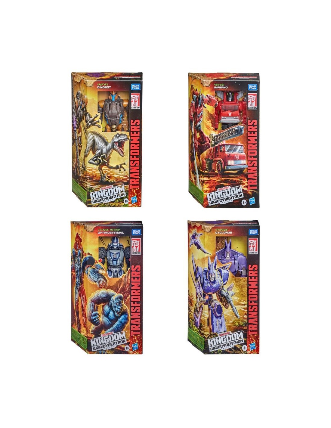 ¡Ahora la batalla es más feroz! Fuerzas descomunales chocan cuando los Maximals y los Predacons se lanzan al combate, uniéndose a los Autobots y Decepticons en una épica batalla que cambiará el destino de todos para siempre. Descomunales y salvajes poderes son desatados en la batalla con los feroces modos bestia de los Maximals y Predacons unidos a la antigua y altamente avanzada tecnología F.O.S.S.I.L. utilizada para dar el poder de las bestias a los Autobots y Decepticons. Esta tecnología permite que los robots Fossilizer, cargados de poderosa energía, puedan separarse en distintos componentes para armar a sus aliados. ¡Desata el salvaje poder de las bestias! Las Figura de Accións Kingdom permiten que los fans desencadenen un feroz poder en el campo de batalla con personajes Beast Wars con modos bestia diseñados con texturas inspiradas en las pieles y pelajes de los animales, y robots Fossilizer que pueden dar el poder de las bestias a otros robots con armas y armaduras óseas. (Se venden por separado. Sujeto a disponibilidad.) Las Figura de Accións clase viajero se convierten en bestias o modos terrestres G12 clásicos y viene con armas inspiradas en las series Beast Wars o G1. Cada Figura de Acción Kingdom incluye una tarjeta de disco dorado que revela el destino posible de ciertos personajes clave. ¡Colecciona otras Figura de Accións Kingdom para revelar todos los destinos alternos de los personajes! (Se venden por separado. Sujeto a disponibilidad). Transformers y todos los personajes relacionados son marcas de comercio de Hasbro.