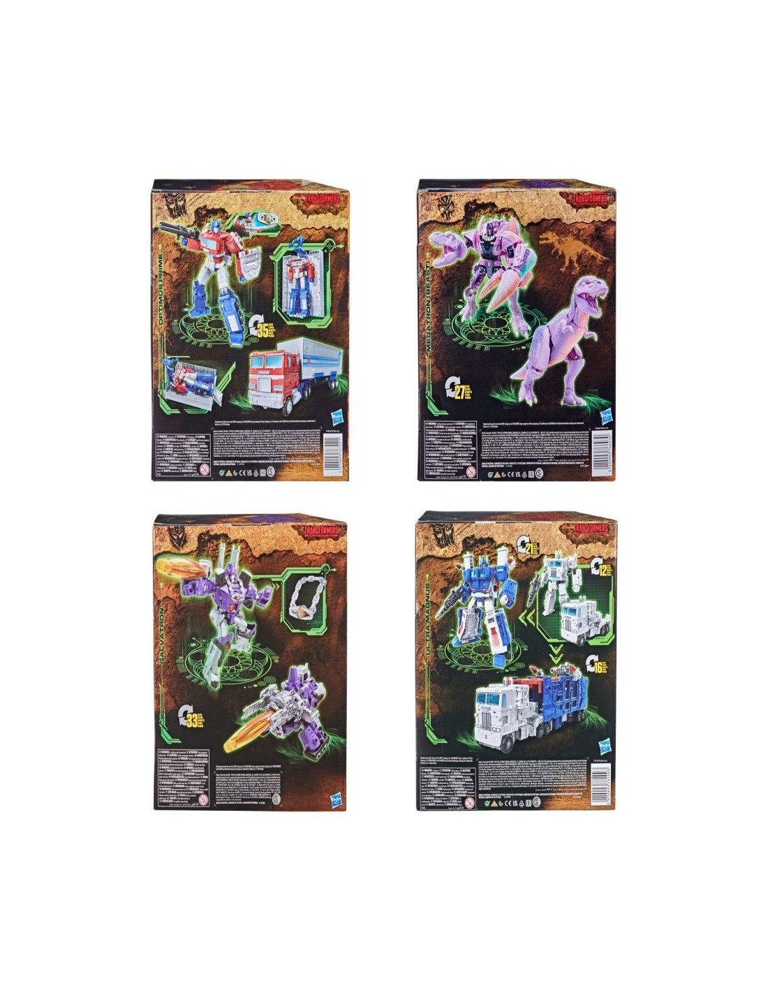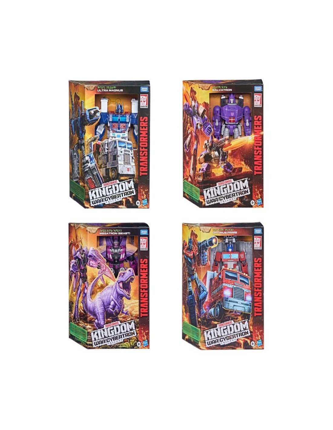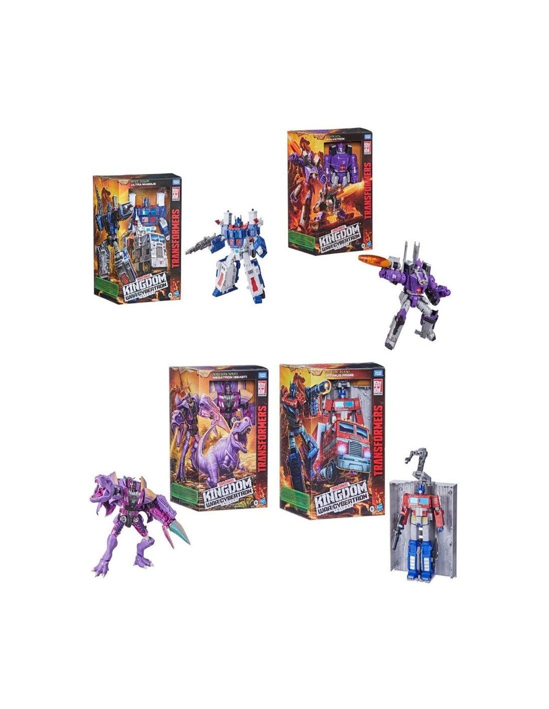 ¡Ahora la batalla es más feroz! Fuerzas descomunales chocan cuando los Maximals y los Predacons se lanzan al combate, uniéndose a los Autobots y Decepticons en una épica batalla que cambiará el destino de todos para siempre. Descomunales y salvajes poderes son desatados en la batalla con los feroces modos bestia de los Maximals y Predacons unidos a la antigua y altamente avanzada tecnología F.O.S.S.I.L. utilizada para dar el poder de las bestias a los Autobots y Decepticons. Esta tecnología permite que los robots Fossilizer, cargados de poderosa energía, puedan separarse en distintos componentes para armar a sus aliados. ¡Desata el salvaje poder de las bestias! Las Figura de Accións Kingdom permiten que los fans desencadenen un feroz poder en el campo de batalla con personajes Beast Wars con modos bestia diseñados con texturas inspiradas en las pieles y pelajes de los animales, y robots Fossilizer que pueden dar el poder de las bestias a otros robots con armas y armaduras óseas. (Se venden por separado. Sujeto a disponibilidad.) Las Figura de Accións clase líder se convierten en bestias o modos terrestres G12 clásicos y viene con armas inspiradas en las series Beast Wars o G1. Cada Figura de Acción Kingdom incluye una tarjeta de disco dorado que revela el destino posible de ciertos personajes clave. ¡Colecciona otras Figura de Accións Kingdom para revelar todos los destinos alternos de los personajes! (Se venden por separado. Sujeto a disponibilidad). Transformers y todos los personajes relacionados son marcas de comercio de Hasbro.
