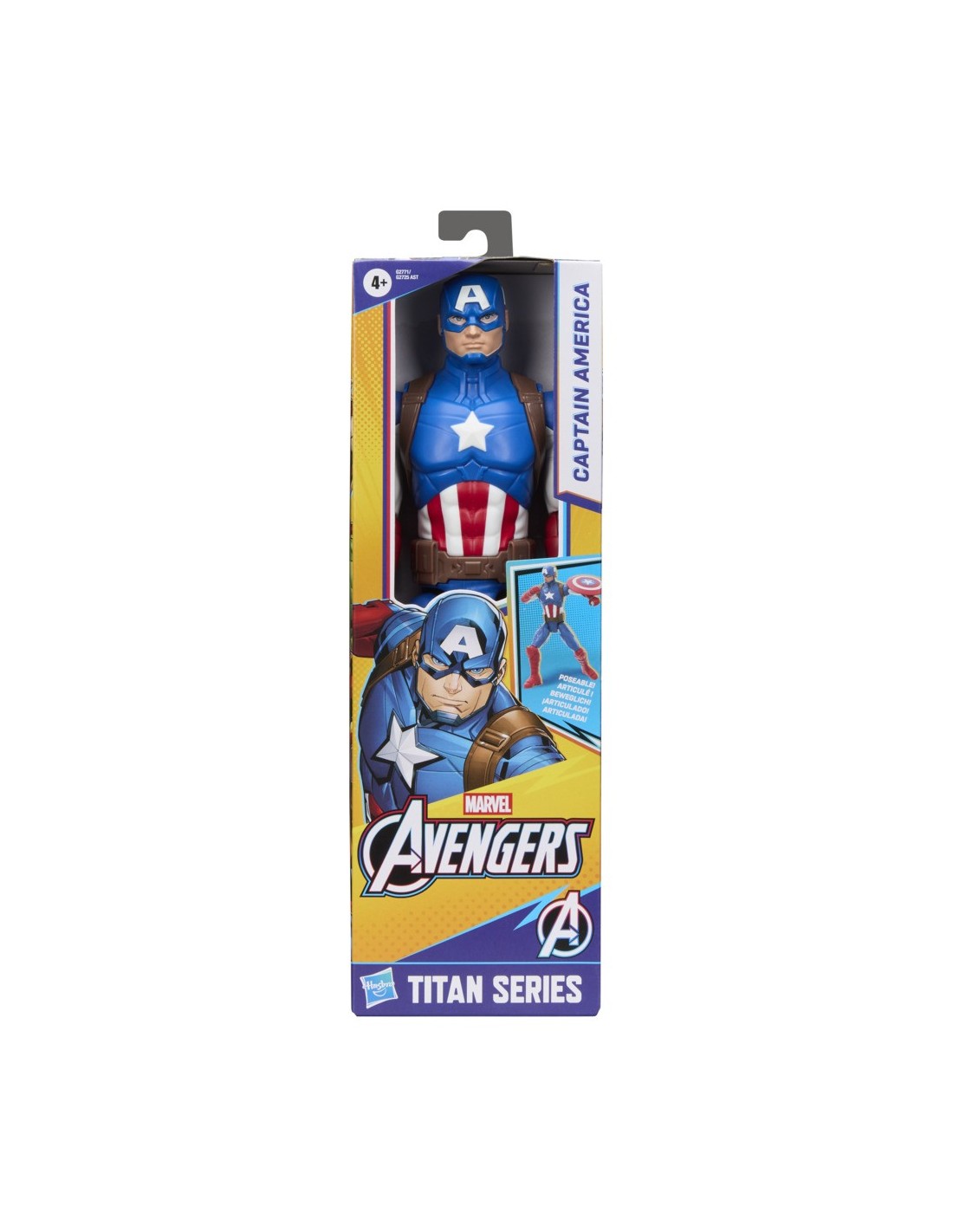 ¡El heroico Steve Rogers defiende al mundo como el Capitán América! Los niños a partir de 4 años podrán imaginar la acción superheroica con este juguete del Capitán América de Marvel Titan Series. Con diseño clásico de Marvel además de 11 puntos de articulación para jugar y colocar la figura en poses, esta figura de 29 cm tiene el tamaño perfecto para los pequeños héroes. ¡Imagina aventuras superpatrióticas y batallas con el poder del vibranio junto a los Vengadores con personajes favoritos de los fans, incluyendo a Iron Man y al Capitán América! ¡Busca otros juguetes de los Vengadores para armar una colección superpoderosa o para darlos como regalos a los niños pequeños, incluyendo figuras de acción, sets de juego, vehículos y equipos para juego de rol para niños y niñas! (Se venden por separado. Sujeto a disponibilidad.) Copyright MARVEL. Todas las marcas registradas y de comercio son propiedad de sus dueños respectivos. HASBRO y todas las marcas y logotipos relacionados son marcas registradas de Hasbro, Inc.