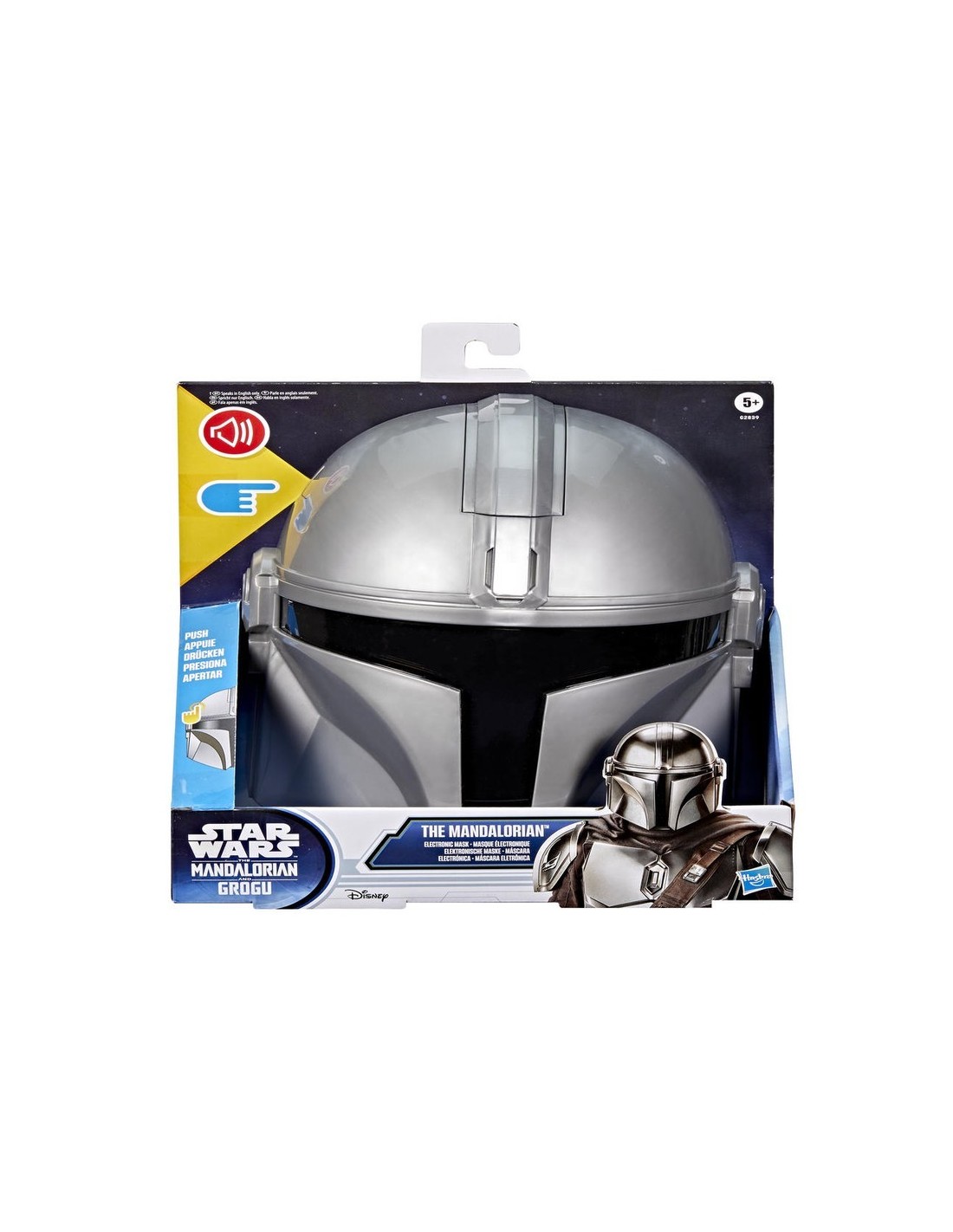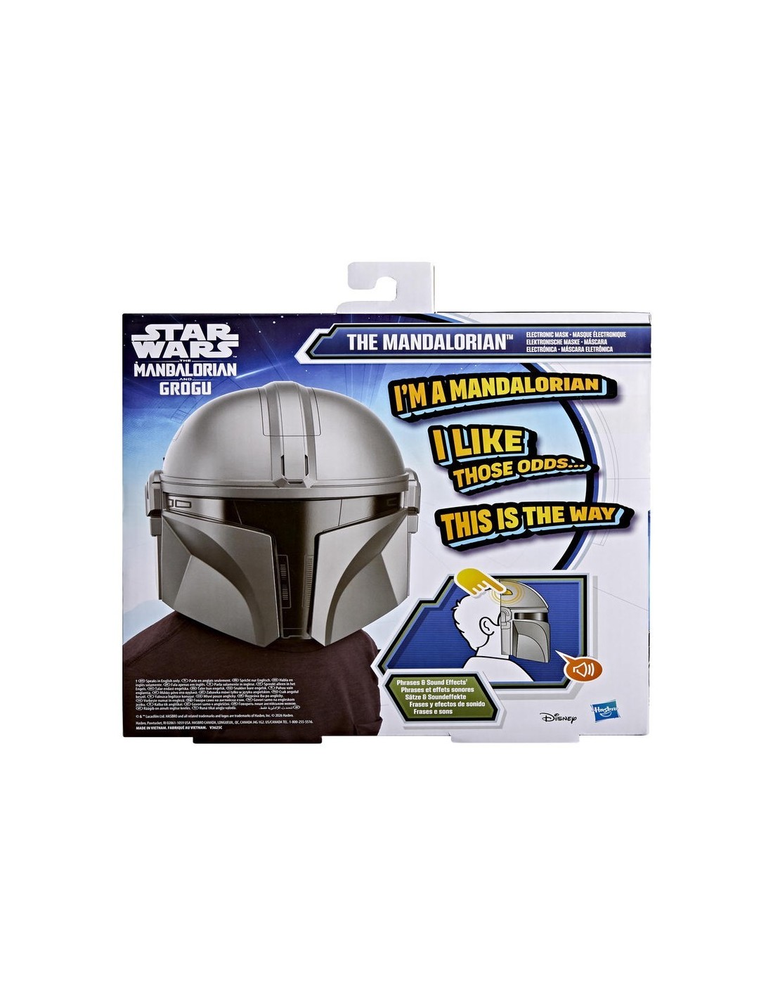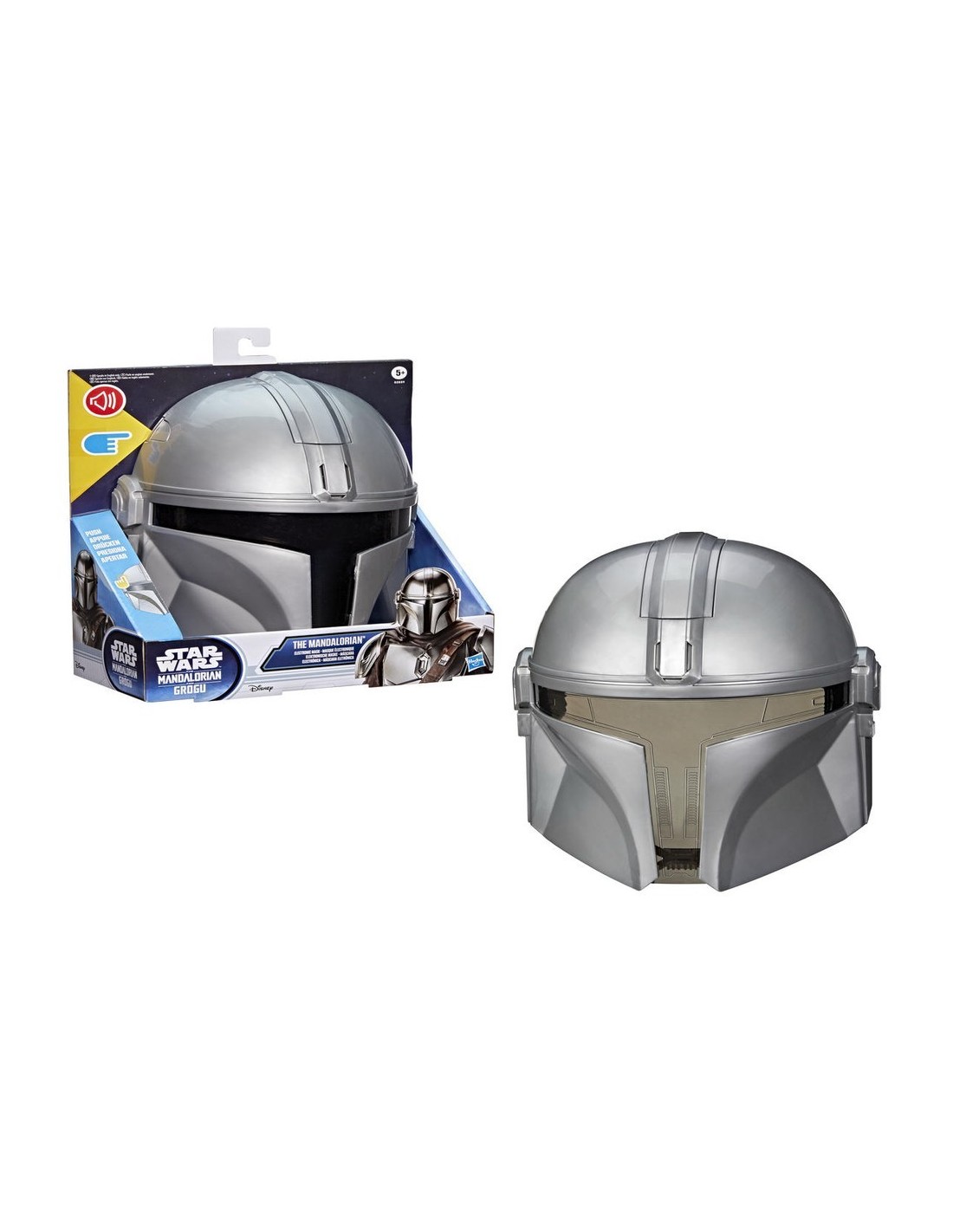 ¡Imagina que eres uno de los personajes favoritos de los fans con la máscara electrónica del Mandaloriano de Star Wars! Esta máscara electrónica Star Wars incluye efectos de sonidos galácticos y frases del Mandaloriano que puedes activar con solo presionar el botón sobre el costado. Este juguete Star Wars cuenta con diseño y detalles inspirados en el casco del Mandaloriano y se adapta a la mayoría de las cabezas de los niños y niñas gracias a su correa ajustable. Las máscaras infantiles son excelentes regalos Star Wars para niños y niñas, además de ser la adición perfecta a los disfraces Star Wars. ¡Completa el disfraz con el Sable oscuro del Mandaloriano! (Se venden por separado. Sujeto a disponibilidad).
