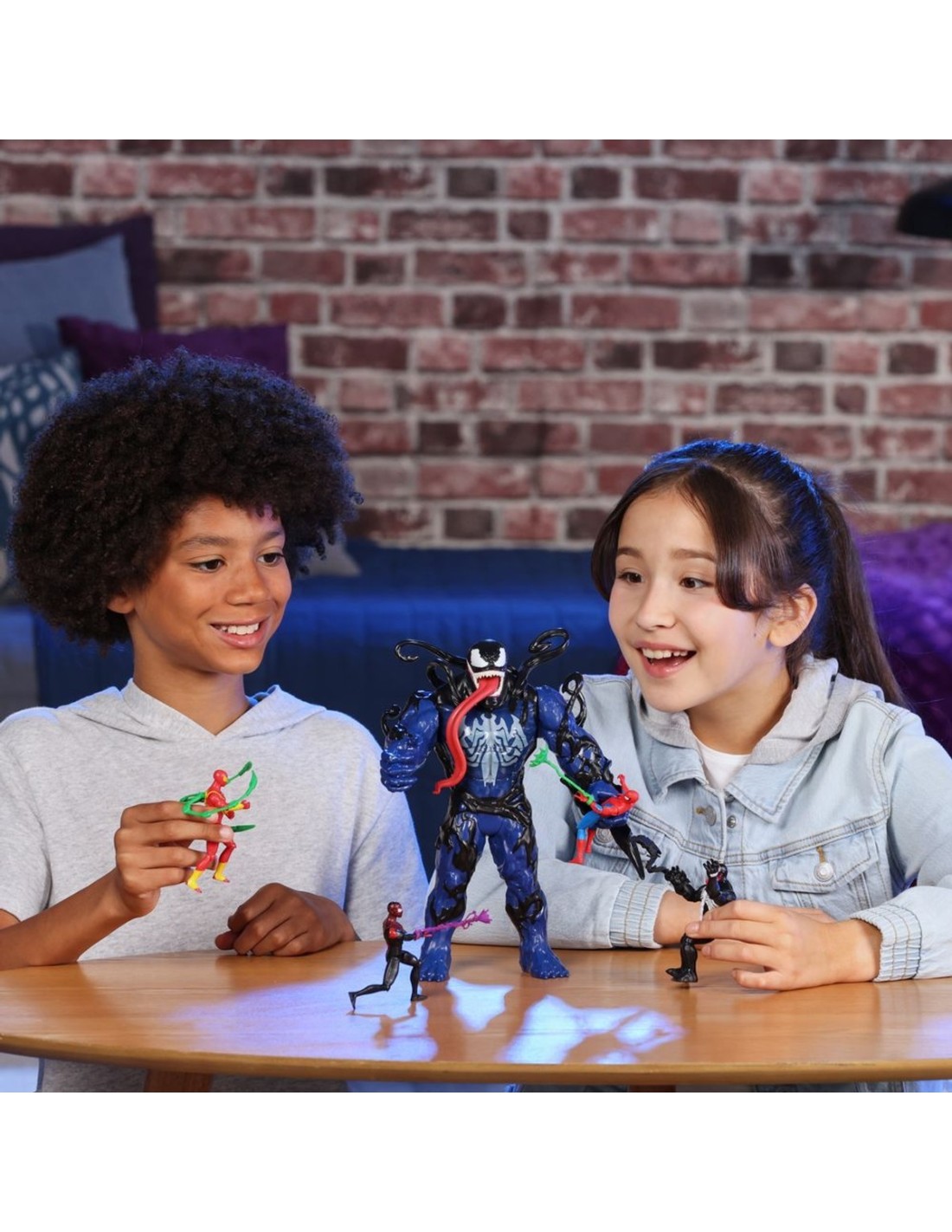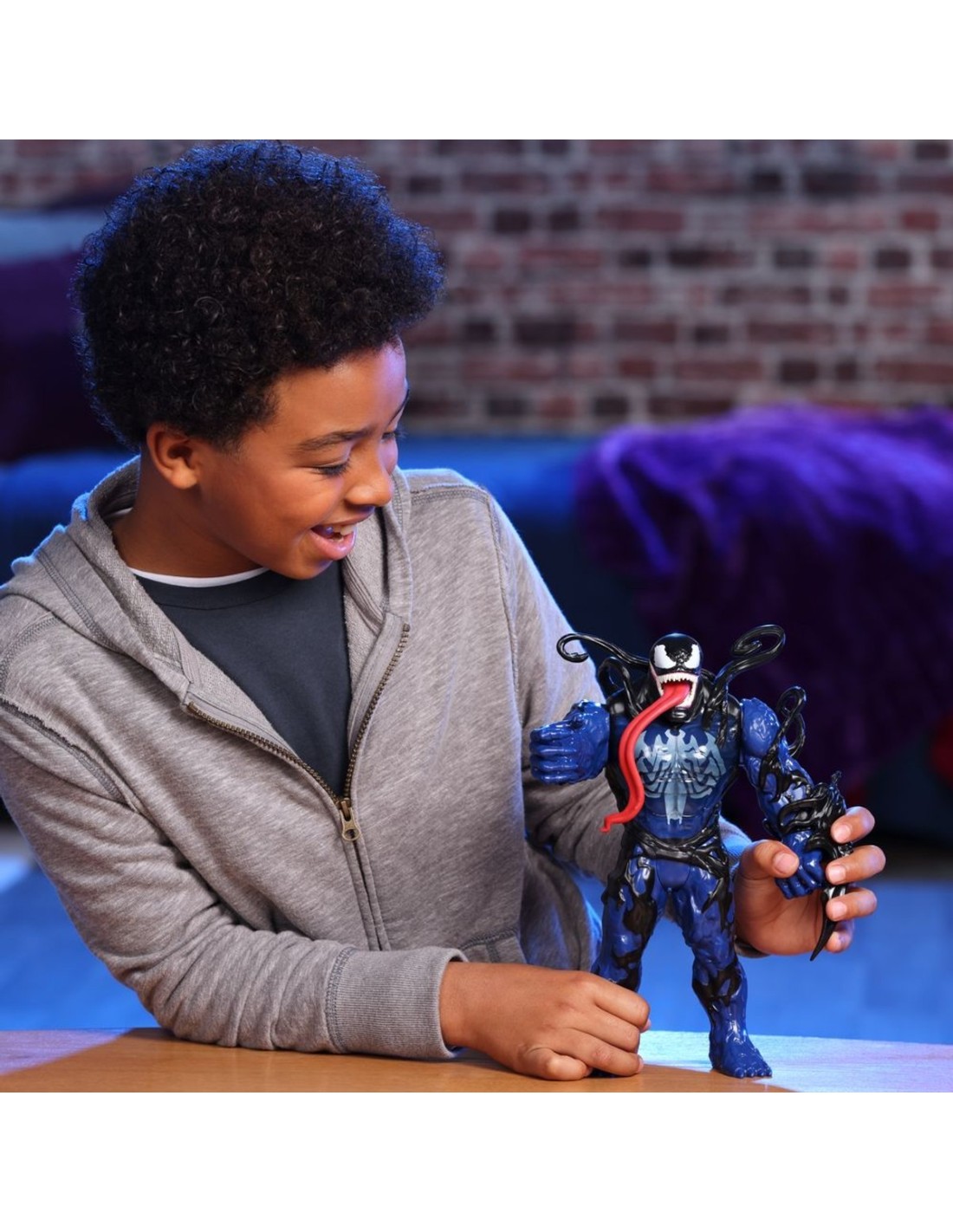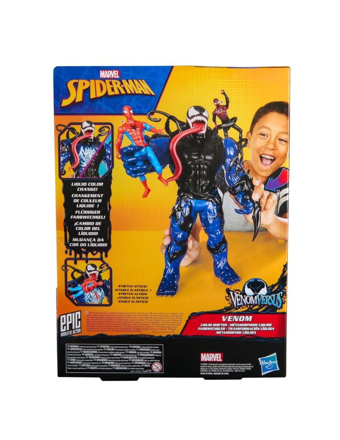 ¡Imagina la acción y la aventura simbionte con los juguetes Marvel Spider-Man VenomVersus! Esta fantástica figura Venom Transformación Líquida mide 27 cm de alto y cuenta con un traje de simbionte venomizado inspirado en los cómics de Marvel. ¡Conecta la garra al juguete de Venom para imaginar sus feroces ataques de alienígena! ¡Luego presiona el brazo de la figura para activar el cambio líquido y ver cómo el líquido negro venomiza al malvado alienígena! Tras soltar el brazo, el líquido negro retrocede. ¡La figura de Venom Transformación Líquida también cuenta con una lengua y tentáculos flexibles que se enredan alrededor de las figuras compatibles Epic World of Action de 10 cm (se venden por separado: sujeto a disponibilidad)! ¡Busca otros juguetes Marvel Spider-Man VenomVersus para niños y niñas para armar una increíble colección del lanzatelarañas o para darlos como regalos! (Se venden por separado. Sujeto a disponibilidad). Copyright MARVEL. Todas las marcas registradas y de comercio son propiedad de sus dueños respectivos. HASBRO y todas las marcas y logotipos relacionados son marcas registradas de Hasbro, Inc.
