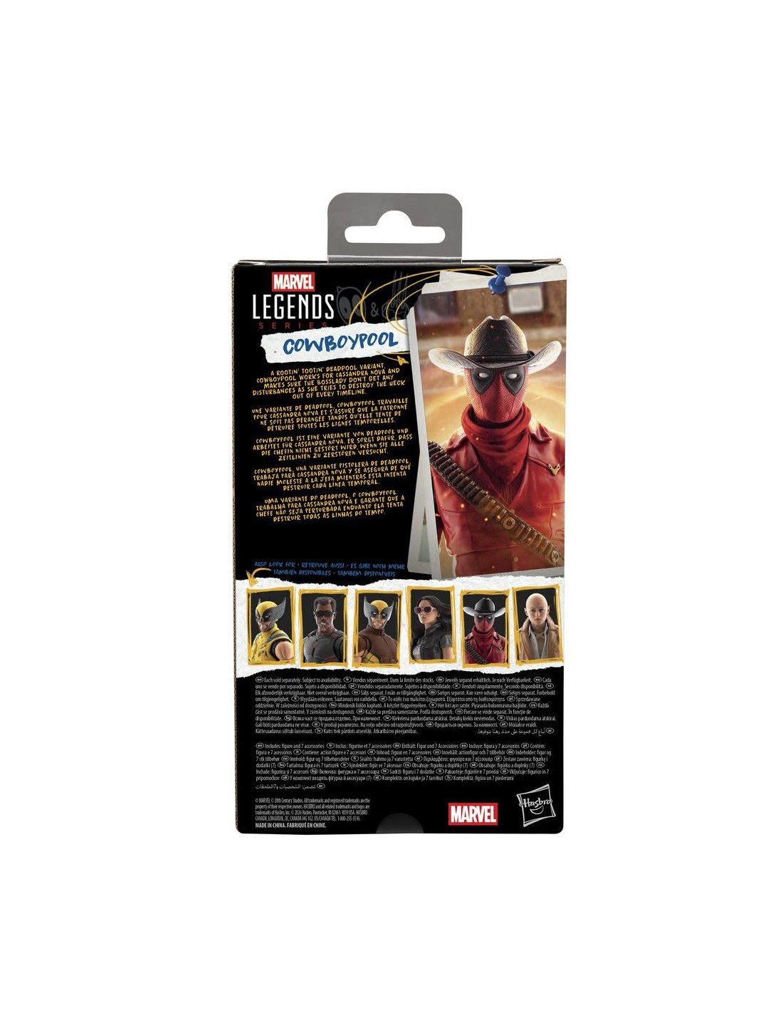 ¡Trae la emoción y la maravilla del Universo Marvel a tu colección con la figura de acción de Cowboypool de la línea Marvel Legends de Hasbro! Esta figura Marvel coleccionable tiene una escala de 15 cm y está inspirada en la apariencia del personaje en la película Deadpool & Wolverine de Marvel Studios. Esta figura de Cowboypool cuenta con diseño premium y cabeza, brazos y piernas completamente articulables. Este set de figura de acción de Marvel viene con 7 accesorios, incluyendo manos alternativas y pistola. Las figuras de acción Marvel de Hasbro a escala de 15 cm son ideales para exhibirlas en las colecciones de los fans. Reimagina escenas inspiradas en la película en tus estantes con las figuras de acción Marvel Legends y los artículos de colección de Marvel. Copyright 2026 MARVEL. © 20th Century Studios. Hasbro y todos los términos relacionados son marcas registradas de Hasbro.