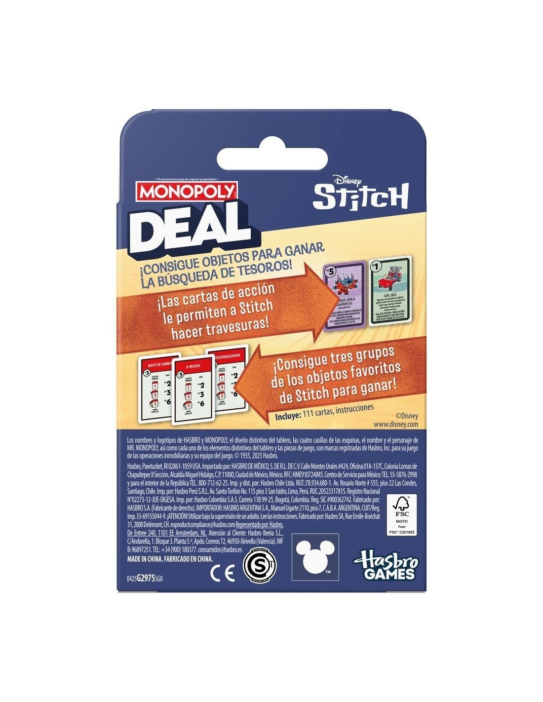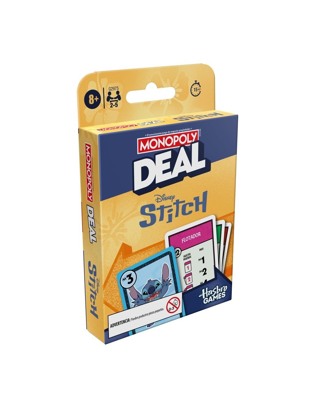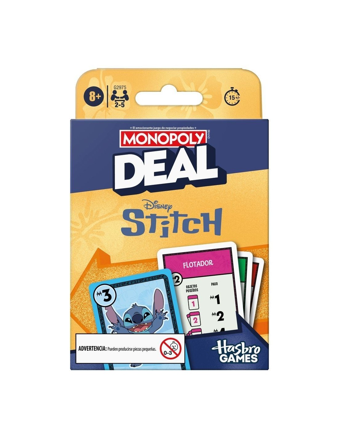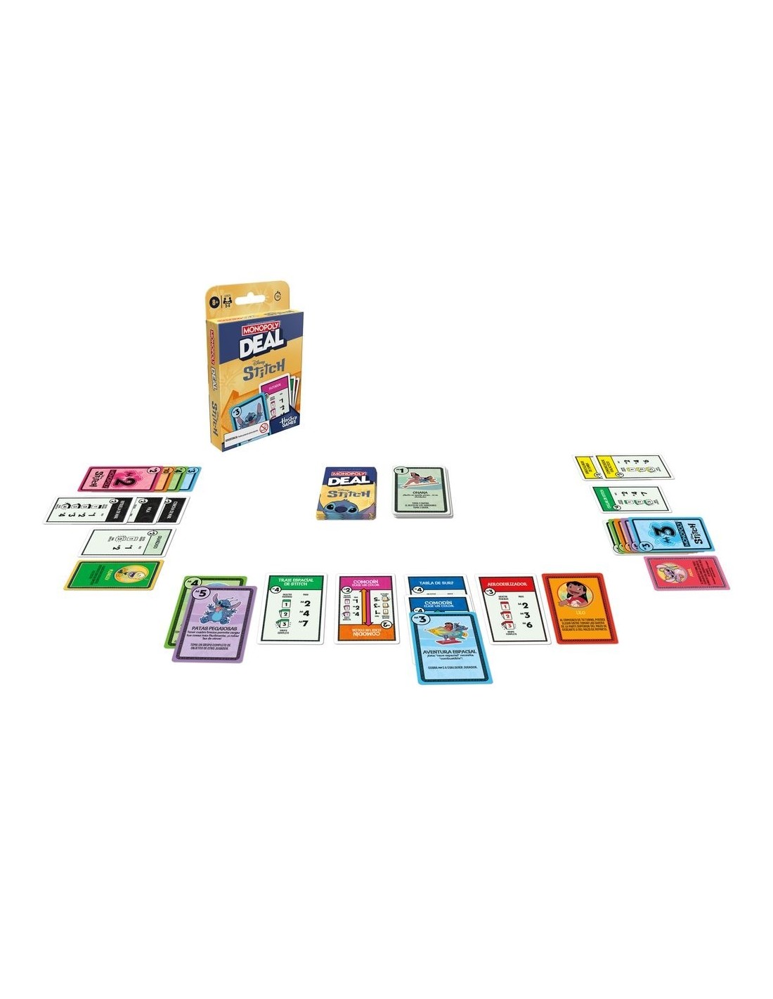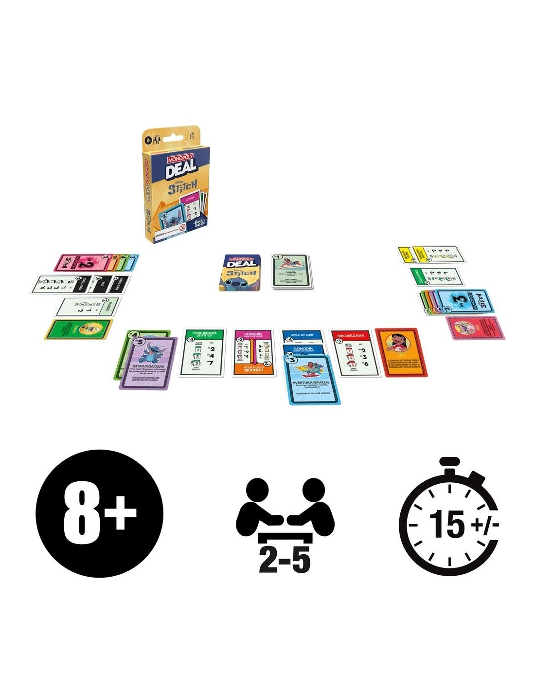 ¡Stitch ha organizado una búsqueda del tesoro por toda la isla! En el juego de cartas para niños Monopoly Deal: Edición Disney Stitch, compite para conseguir objetos conocidos del mundo de Stitch. ¡Gana la búsqueda al ser el primero en conseguir 3 sets de objetos diferentes! Durante la partida, llama al travieso alienígena con las tarjetas de acción que te permiten cobrar dinero e intercambiar y robar objetos. Este juego de cartas familiar para niños y adultos se puede jugar en 15 minutos, así que es perfecto para las noches de juego y para jugar en cualquier momento. Los juegos de cartas de Monopoly para niños y adultos también son ideales como juegos de viaje. Además, Los juguetes y juegos familiares de Disney Stitch son fabulosos como regalos de fiestas y de cumpleaños para niños y niñas a partir de 8 años.
