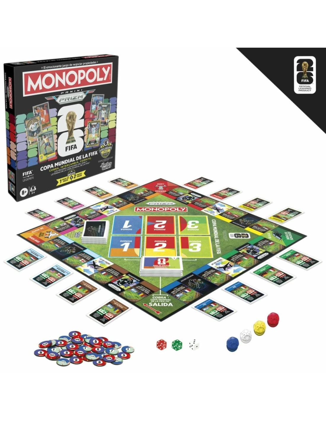 MONOPOLYCOLECCIONA, INTERCAMBIA, COMPITE: ¡Compite por la gloria en la Copa mundial de la FIFA 2026 con este juego de mesa Monopoly Panini Prizm: Copa mundial de la FIFA! Incluye cartas coleccionables Monopoly Panini Prizm Copa mundial de la FIFA 2026