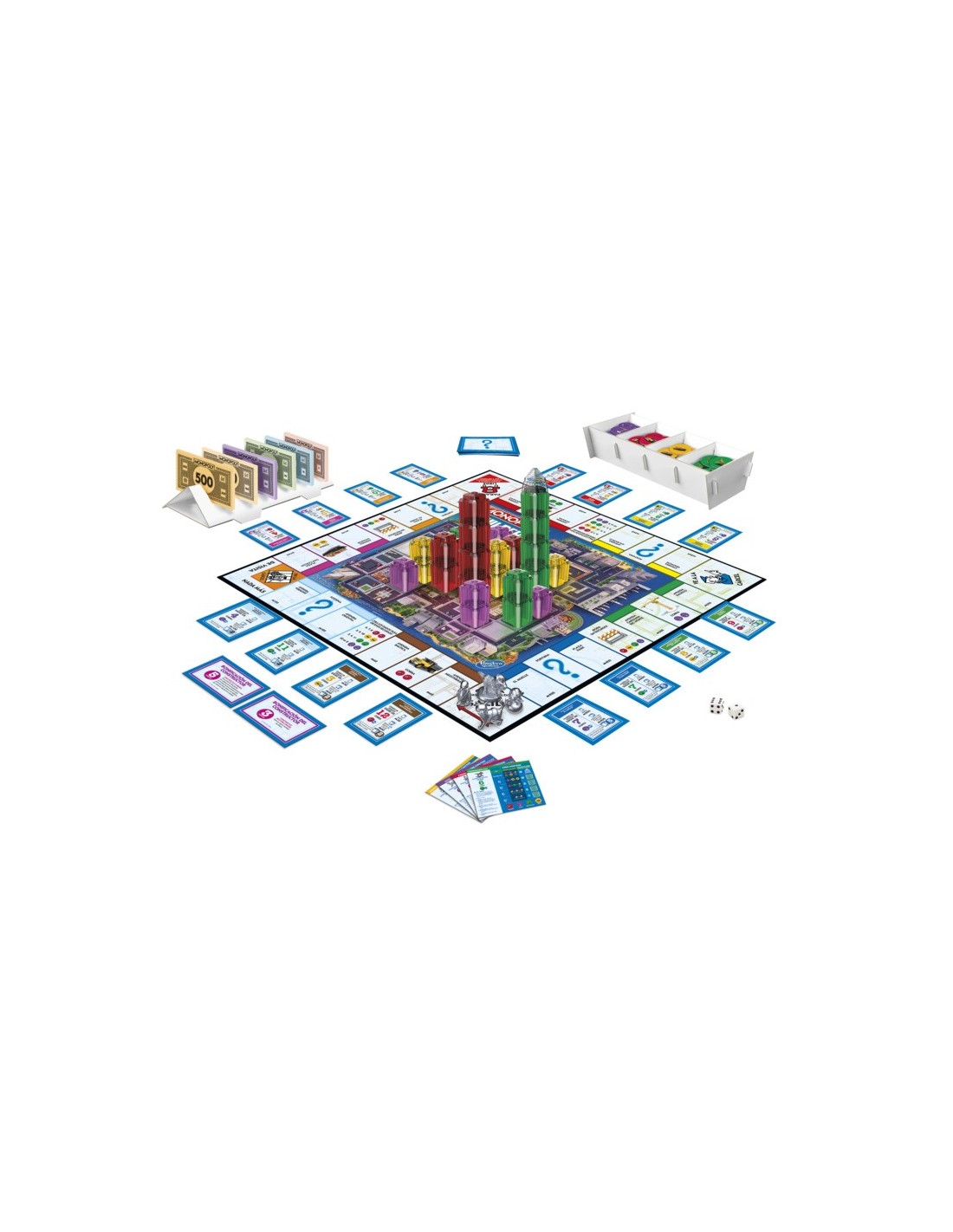 Los nombres y logotipos de Hasbro Gaming, Parker Brothers y Monopoly, el diseño distintivo del tablero de juego, las cuatro casillas de las esquinas, el nombre y el personaje del Sr. Monopoly, así como cada uno de los elementos distintivos del tablero y las piezas de juego son marcas registradas de Hasbro para su juego de intercambio de propiedades y su equipo de juego.