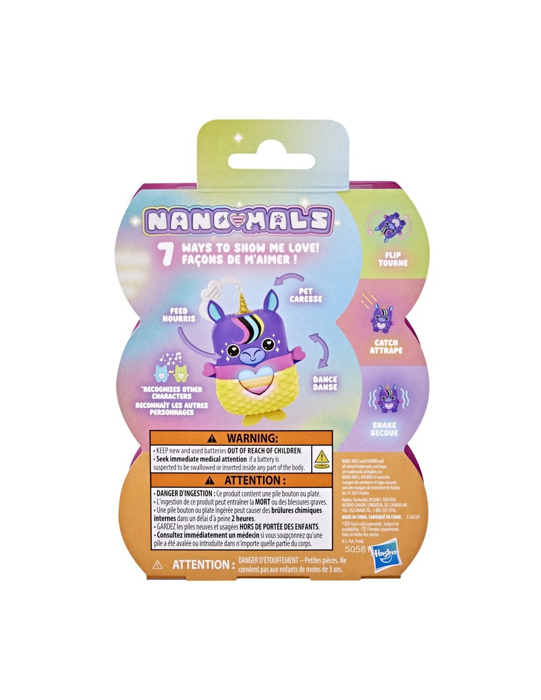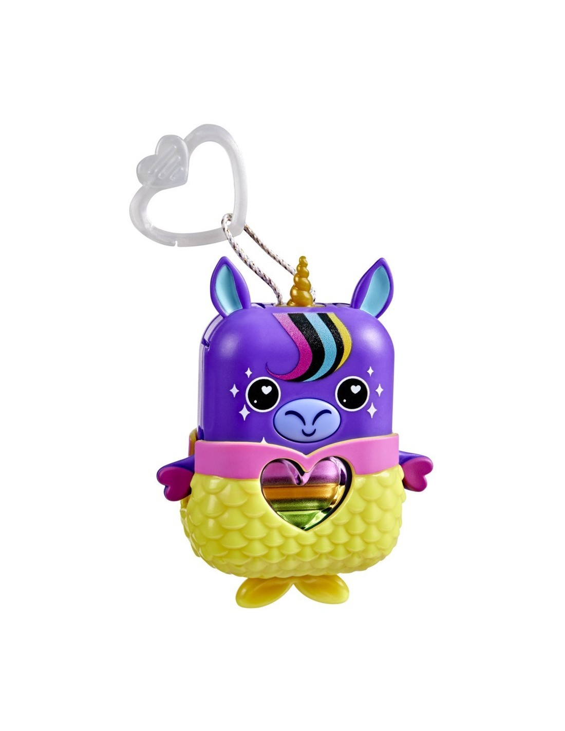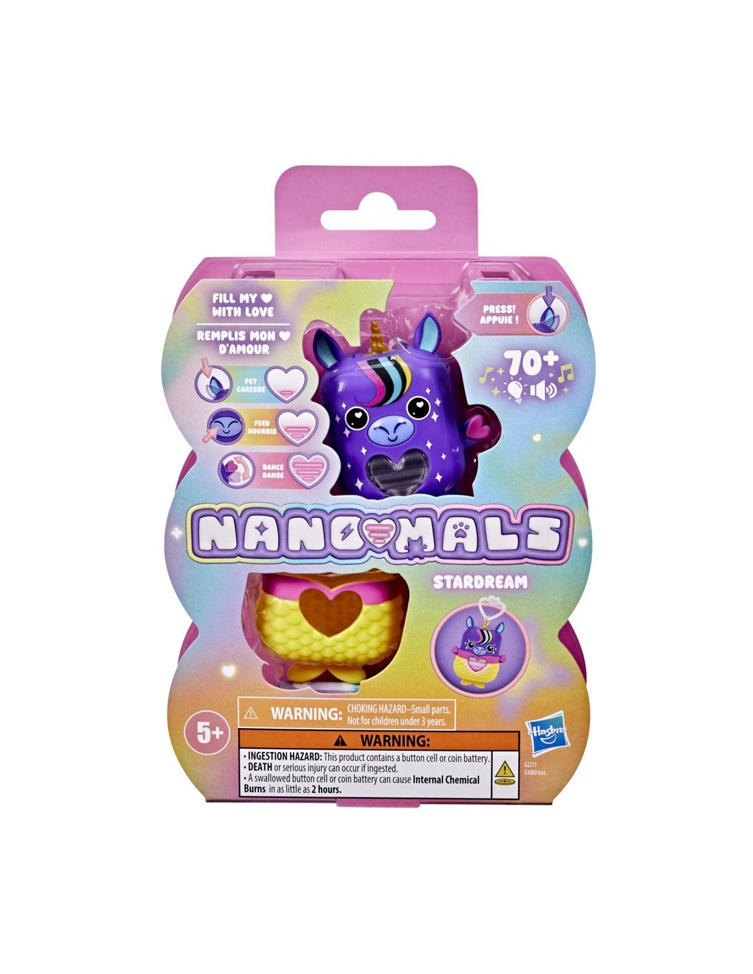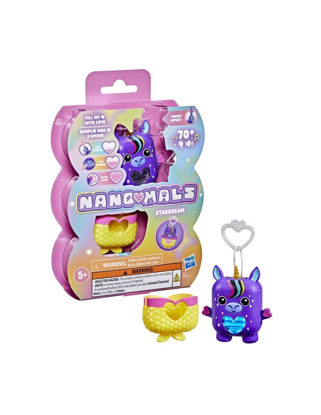 ¡Desbloquea un mundo de estilizadas e interactivas mascotas de bolsillo con la Nano-mal Stardream la unicornio! Los Nano-mals son juguetes interactivos electrónicos y adorables minicompañeros que necesitan tu amor. Cada personaje Nano-mal tiene un medidor de amor que cambia de color y que los más pequeños pueden llenar de muchas maneras divertidas. Cuando el medidor de amor de Stardream está vacío, hará sonidos para hacerte saber que necesita tus cuidados. Si está azul, necesita caricias: presiona sus orejas. Si está naranja, tiene hambre: presiona su boca para simular que la alimentas. ¿Está de color rosa? Sube y baja sus brazos para hacer que baile. ¿Y si está morado? ¡Quiere moverse! Gírala, atrápala o sacúdela para llenar su corazón. Stardream celebrará que su corazón está lleno de amor con una canción y un colorido show de luces. Dale un poco más de estilo a Stardream con una ropita texturizada de sirena que puedes ponerle y quitarle. Además, cuenta con un clip, por lo que es ideal como llavero infantil. Los Nano-mals son perfectos regalos para los niños y las niñas que adoran los animales de juguete, las mascotas digitales y los juguetes de tipo fidget.