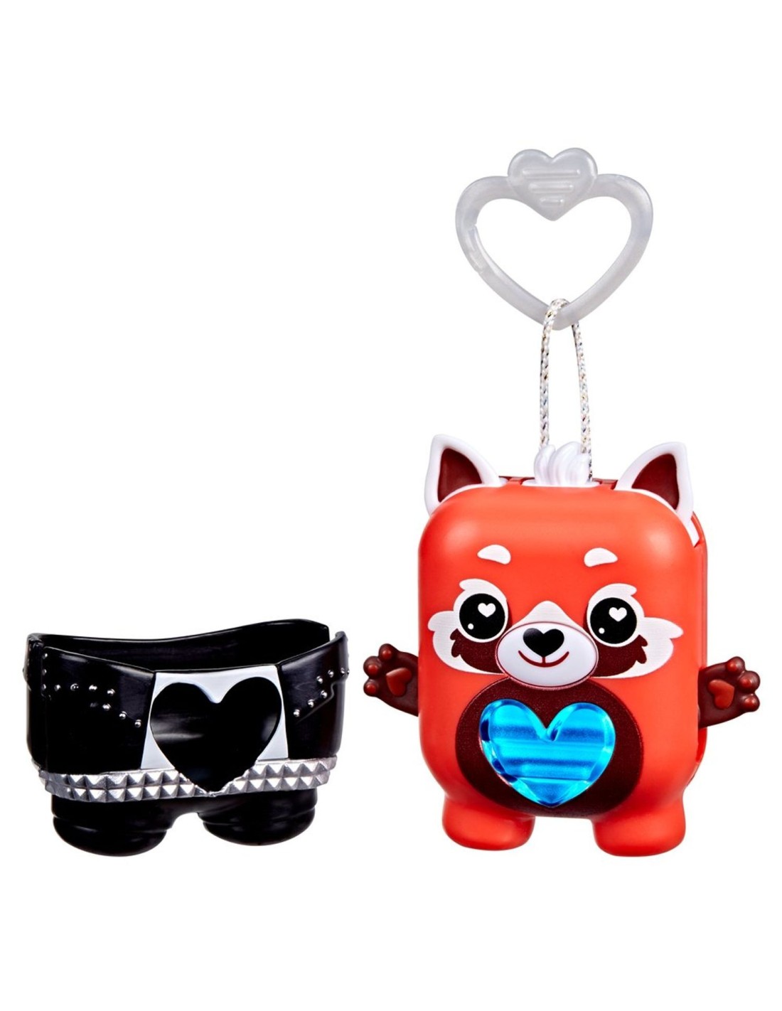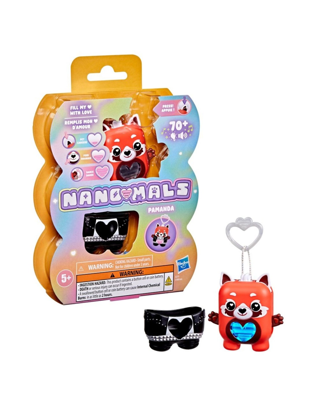 ¡Desbloquea un mundo de estilizadas e interactivas mascotas de bolsillo con la Nano-mal Pamanda la panda roja! Los Nano-mals son juguetes interactivos electrónicos y adorables minicompañeros que necesitan tu amor. Cada personaje Nano-mal tiene un medidor de amor que cambia de color y que los más pequeños pueden llenar de muchas maneras divertidas. Cuando el medidor de amor de Pamanda está vacío, hará sonidos para hacerte saber que necesita tus cuidados. Si está azul, necesita caricias: presiona sus orejas. Si está naranja, tiene hambre: presiona su boca para simular que la alimentas. ¿Está de color rosa? Sube y baja sus brazos para hacer que baile. ¿Y si está morado? ¡Quiere moverse! Gírala, atrápala o sacúdela para llenar su corazón. Pamanda celebrará que su corazón está lleno de amor con una canción y un colorido show de luces. Dale un poco más de estilo a Pamanda con una ropita texturizada de roquera que puedes ponerle y quitarle. Además, cuenta con un clip, por lo que es ideal como llavero infantil. Los Nano-mals son perfectos regalos para los niños y las niñas que adoran los animales de juguete, las mascotas digitales y los juguetes de tipo fidget.
