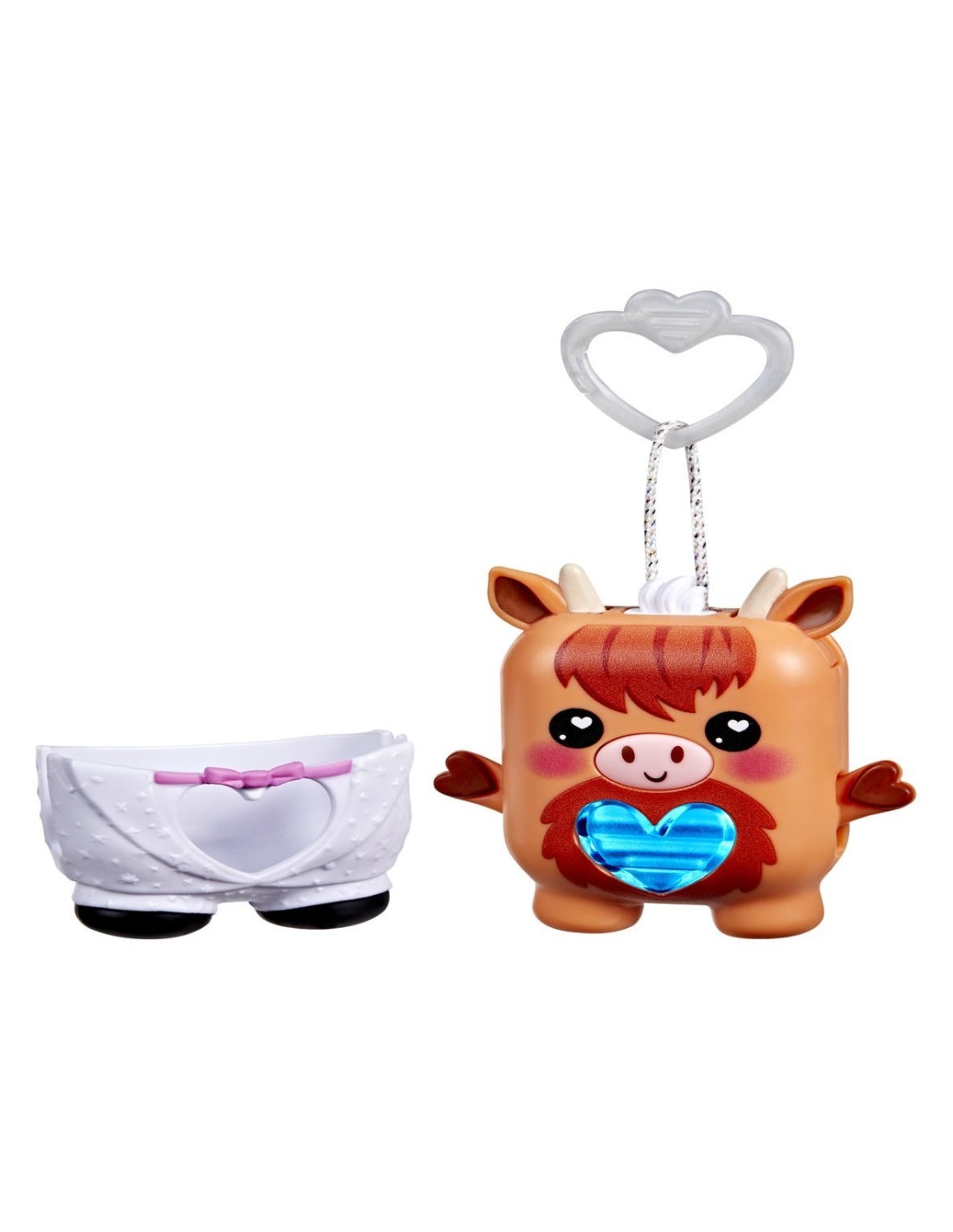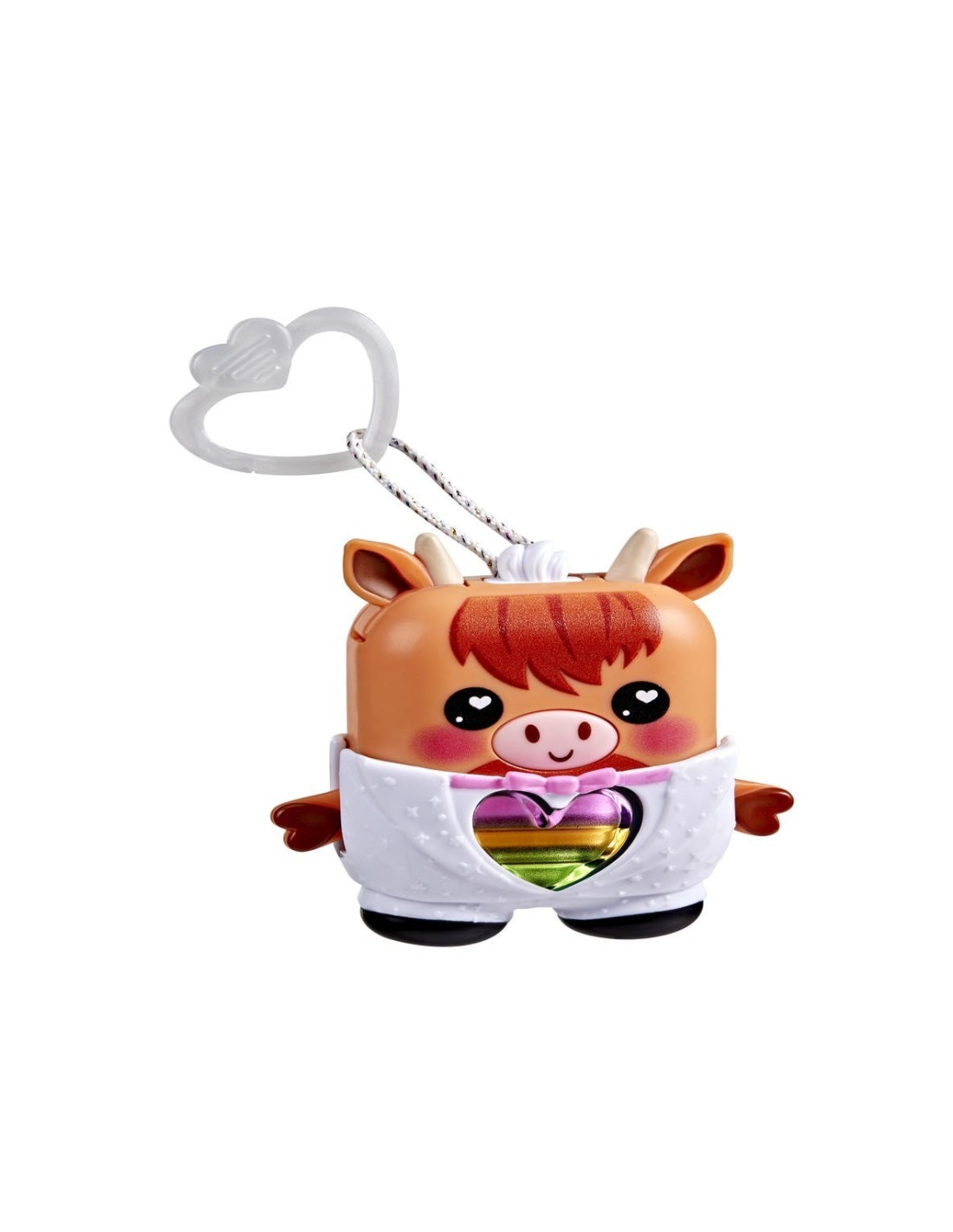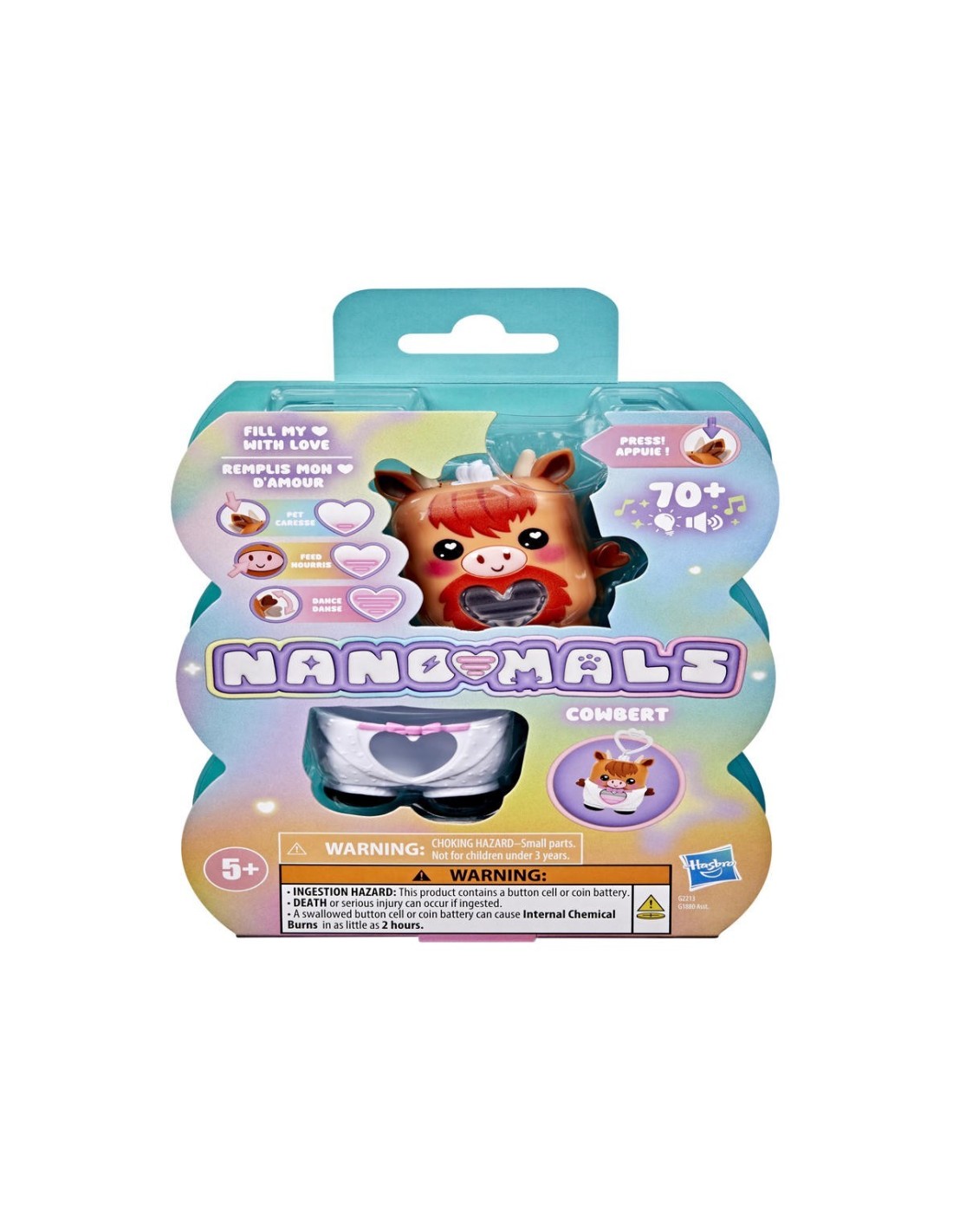 ¡Desbloquea un mundo de estilizadas e interactivas mascotas de bolsillo con el Nano-mal Cowbert el toro de montaña! Los Nano-mals son juguetes interactivos electrónicos y adorables minicompañeros que necesitan tu amor. Cada personaje Nano-mal tiene un medidor de amor que cambia de color y que los más pequeños pueden llenar de muchas maneras divertidas. Cuando el medidor de amor de Cowbert está vacío, hará sonidos para hacerte saber que necesita tus cuidados. Si está azul, necesita caricias: presiona sus orejas. Si está naranja, tiene hambre: presiona su boca para simular que lo alimentas. ¿Está de color rosa? Sube y baja sus brazos para hacer que baile. ¿Y si está morado? ¡Quiere moverse! Gíralo, atrápalo o sacúdelo para llenar su corazón. Cowbert celebrará que su corazón está lleno de amor con una canción y un colorido show de luces. Dale un poco más de estilo a Cowbert con un esmoquin blanco texturizado que puedes ponerle y quitarle. Además, cuenta con un clip, por lo que es ideal como llavero infantil. Los Nano-mals son perfectos regalos para los niños y las niñas que adoran los animales de juguete, las mascotas digitales y los juguetes de tipo fidget.