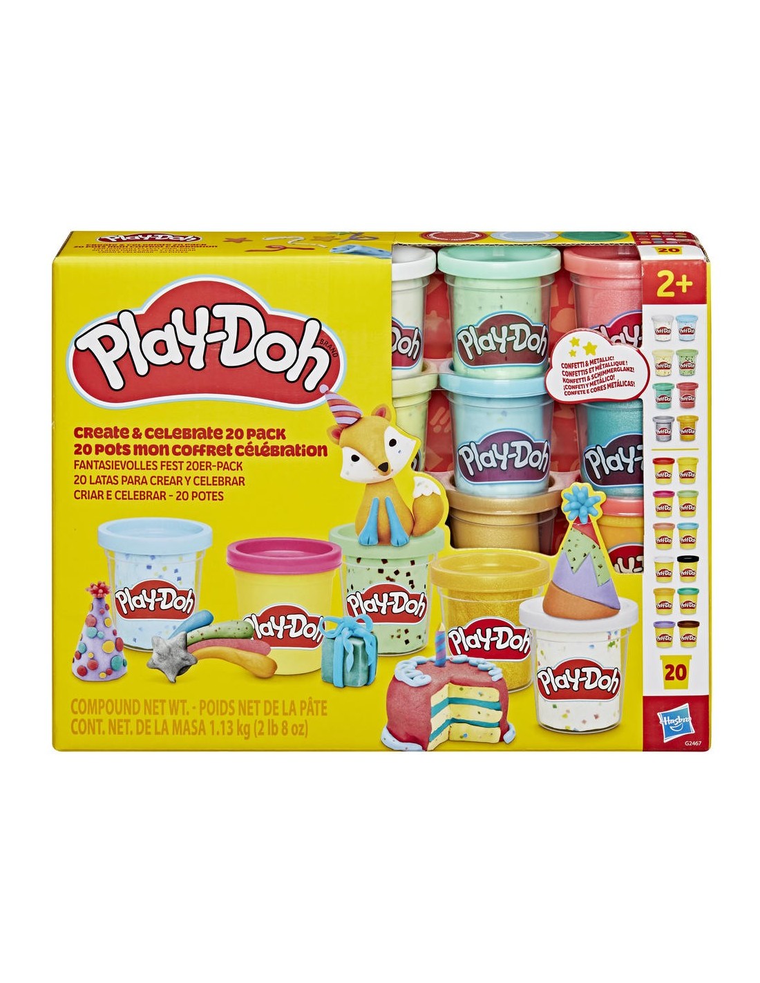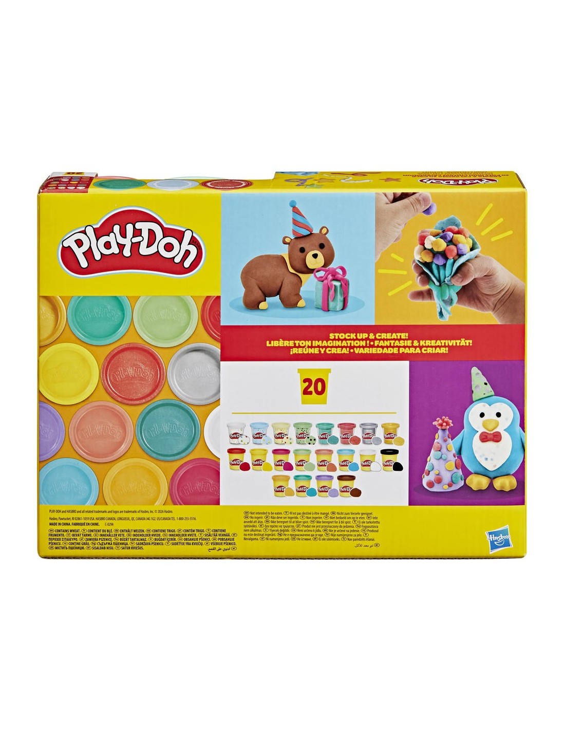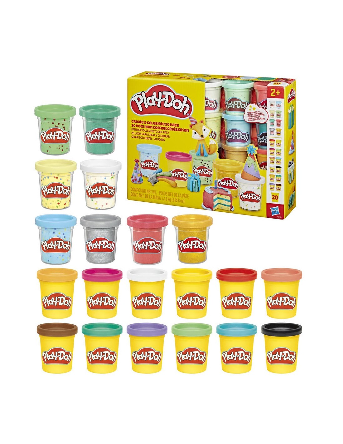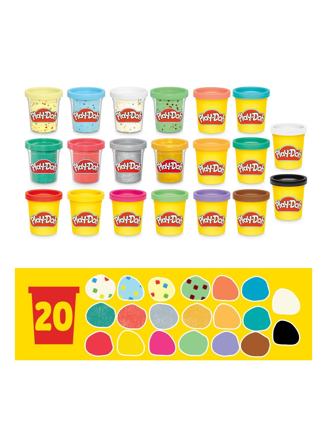 El set 20 latas para crear y celebrar está listo para las ideas creativas que los más pequeños puedan imaginar. Ya sea que te estás abasteciendo de colores esenciales o que quieres un regalo infantil sencillo, este pack de 20 botes incluye una variedad de botes de 56 gramos para estimular el juego sensorial. ¡Eso quiere decir 1,13 kilogramos de blanda y colorida diversión dentro de una caja! Los colores van desde confeti y metálicos intensos hasta un arcoíris de colores sólidos, además de negro, blando y marrón para añadir detalles a tus creaciones. Este set Play-Doh es un excelente regalo infantil para premios en clases, Pascua, cumpleaños y muchas otras ocasiones. PLAY-DOH y HASBRO y todas las marcas registradas y logotipos son marcas registradas de Hasbro, Inc.