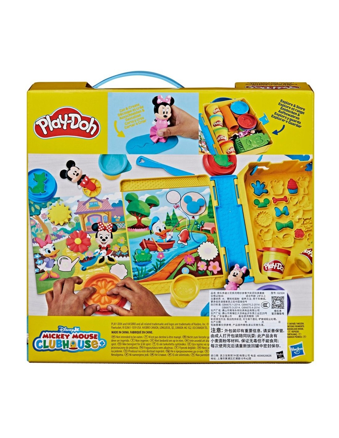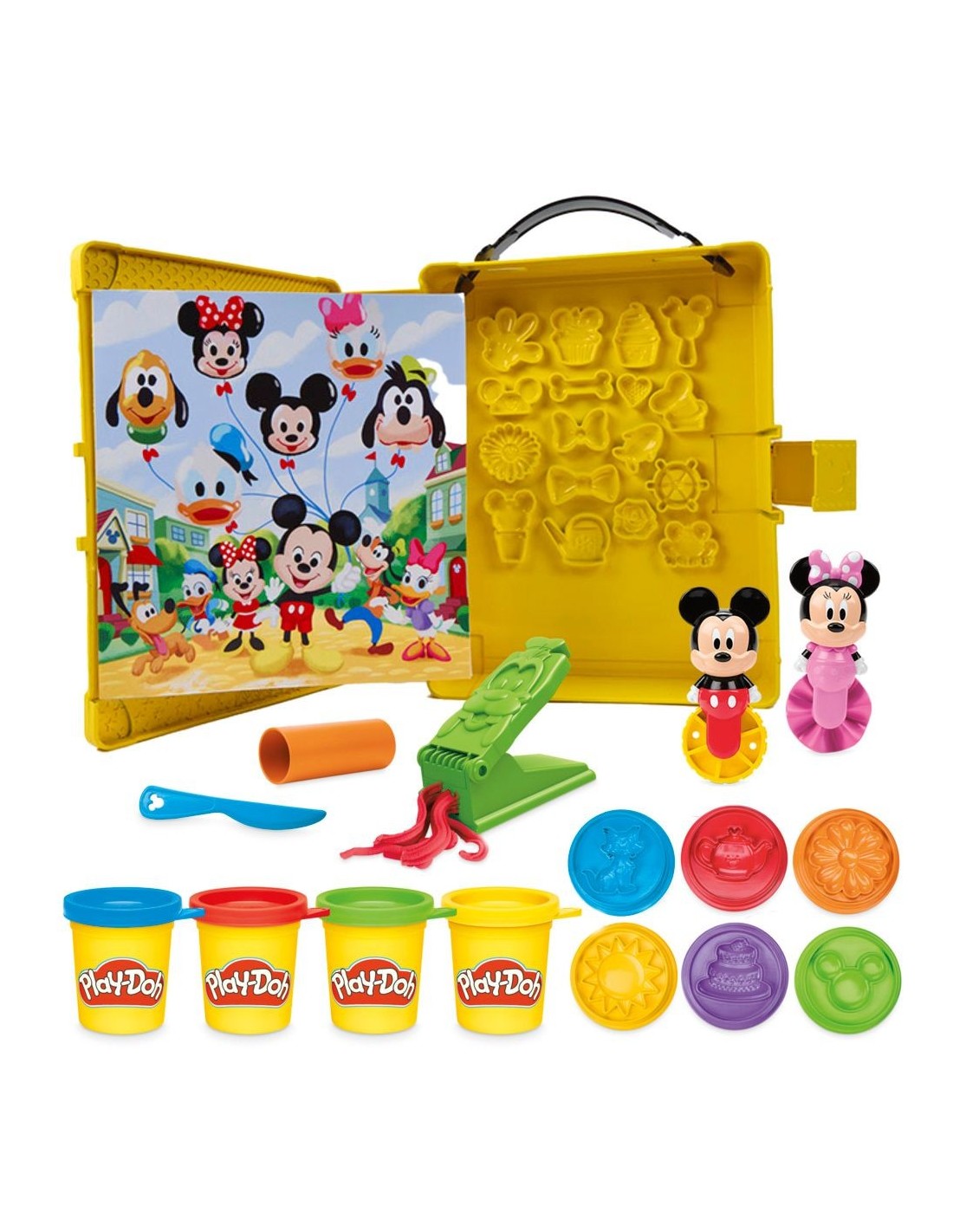 ¡Hay tantas maneras de crear y de explorar con el set Play-Doh Disney Junior Crea una historia! Abre el set de juego con tema de libro de cuentos para niños y crea 4 escenas distintas con las herramientas, la plastilina y los manteles. Los 11 accesorios de Disney incluyen ruedas de Mickey y de Minnie Mouse, una Fábrica de Diversión de Goofy, un cuchillo, un rodillo y 6 sellos. El almacenamiento también cuenta con varios medios moldes integrados para crear aún más formas divertidas. Los 6 botes de colores Play-Doh tienen lengüetas en las tapas para abrirlos con facilidad y empezar a jugar. Al terminar con la diversión del día, simplemente guarda todas las piezas dentro del set de juego hasta la próxima aventura. Copyright Disney. PLAY-DOH y HASBRO y todas las marcas registradas y logotipos son marcas registradas de Hasbro, Inc.