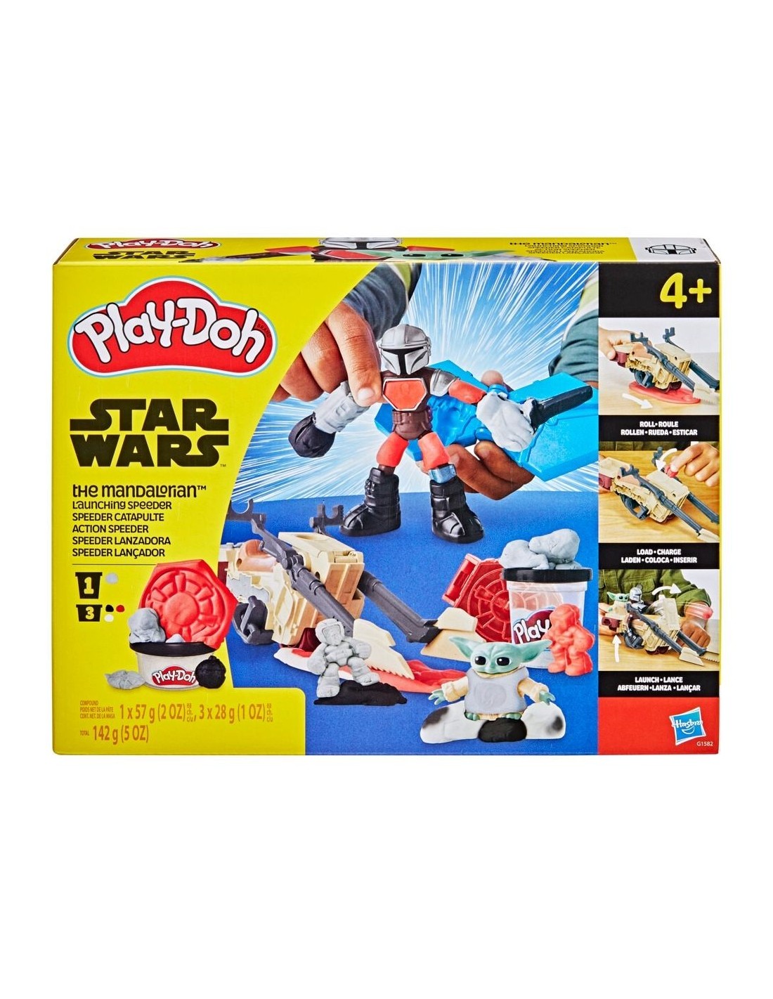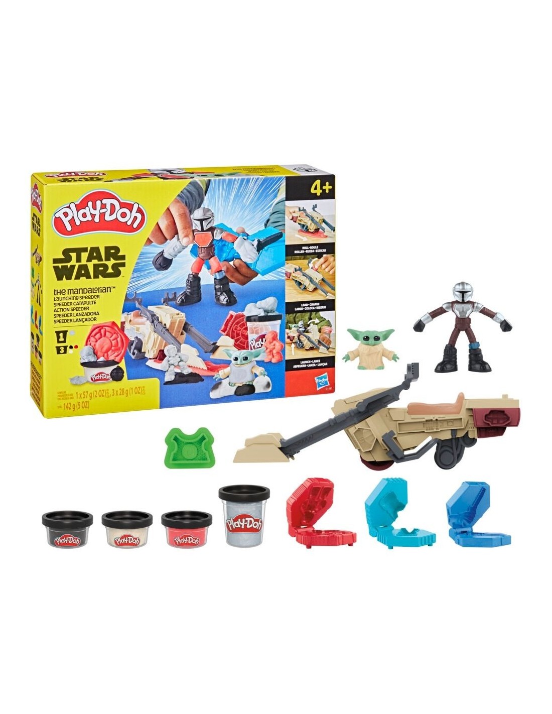 Lánzate a épicas aventuras con este set de juego Play-Doh que incluye la Speeder lanzadora del Mandaloriano. El juego imaginativo es todavía más divertido con la plastilina Play-Doh y las figuras STAR WARS. Rueda la moto speeder sobre la plastilina Play-Doh para moldear municiones y lanzarlas con la catapulta frontal. Siente la blanda textura de las figuras de Grogu y el Mandaloriano. Los más pequeños podrán crear accesorios, SABLES DE LUZ, guanteletes Play-Doh y mucho más con los moldes tipo libro, que también sirven como bases de exhibición. Este set Play-Doh es un excelente regalo infantil y permite a los niños y las niñas combinar las manualidades con los juguetes STAR WARS. Edad recomendada: A partir de 4 años. Los productos STAR WARS son fabricados por Hasbro bajo licencia de Lucasfilm Ltd. PLAY-DOH y HASBRO y todas las marcas registradas y logotipos son marcas registradas de Hasbro, Inc.