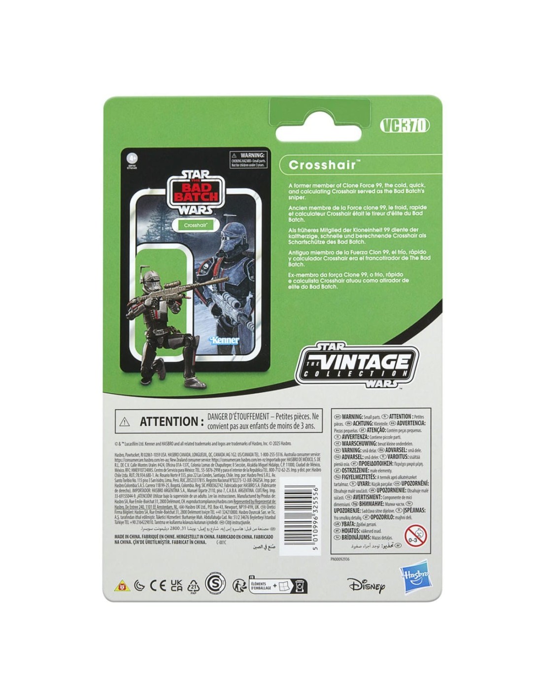 Celebra el legado de Star Wars con figuras de acción, sets de juego y vehículos premium de la colección Vintage de Star Wars. (Los productos adicionales se venden por separado. Sujeto a disponibilidad). Inspirada en el personaje de Crosshair de la serie Star Wars: The Bad batch, esta figura a escala de 9,5 cm es una fantástica adición a toda colección. Inspiradas en la línea original, estas figuras coleccionables y sus empaques cuentan con detalles y diseños premium. Asimismo, la decoración alcanza el nivel de un objeto de colección que los fans conocen y aman. ¡Que la Fuerza te acompañe!