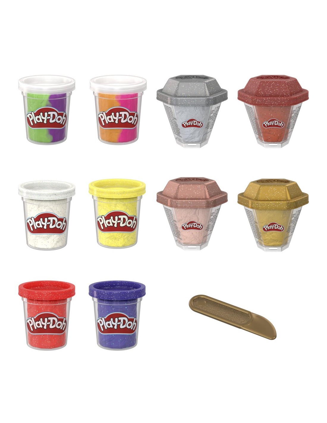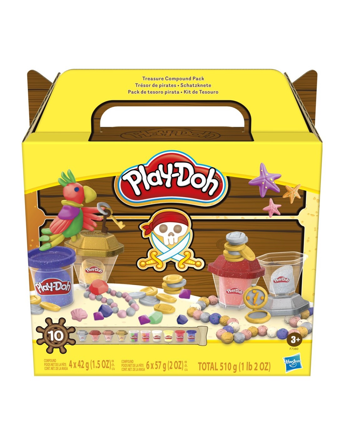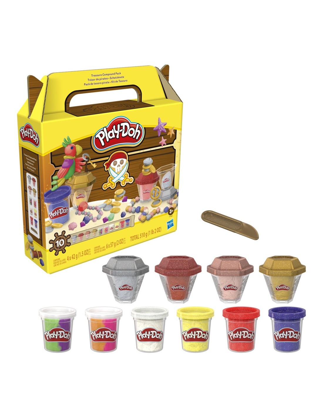 ¡Descubre todo un tesoro de diversión con el Pack de tesoro pirata Play-Doh! Este pack de 10 botes de plastilina Play-Doh cuenta con 4 colores metálicos brillantes en botes con forma de gemas, 4 colores brillantes adicionales y 2 botes de dos colores para que los niños creen monedas brillantes, gemas resplandecientes ¡y todos los demás tesoros de pirata que puedan imaginar! Estos juguetes para niños y niñas a partir de 3 años son un regalo extraordinario para cumpleaños y otras fiestas. Este set fascinará a quienes les gusten los juguetes de piratas